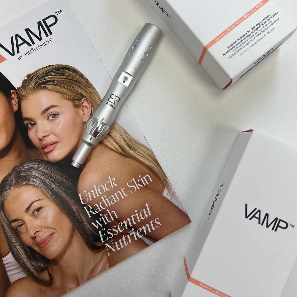 VAMP Skin Booster: The VAMP Skin Booster is an advanced bio-revitalizing solution enriched with a powerful blend of vitamins, amino acids, minerals, antioxidants, and free hyaluronic acid. Its formulation includes PDRN (polydeoxyribonucleotide), a component derived from purified salmon DNA, renowned for its regenerative properties and ability to enhance skin repair and rejuvenation. When combined with microneedling, the VAMP Skin Booster delivers these essential nutrients directly into the skin, promoting: