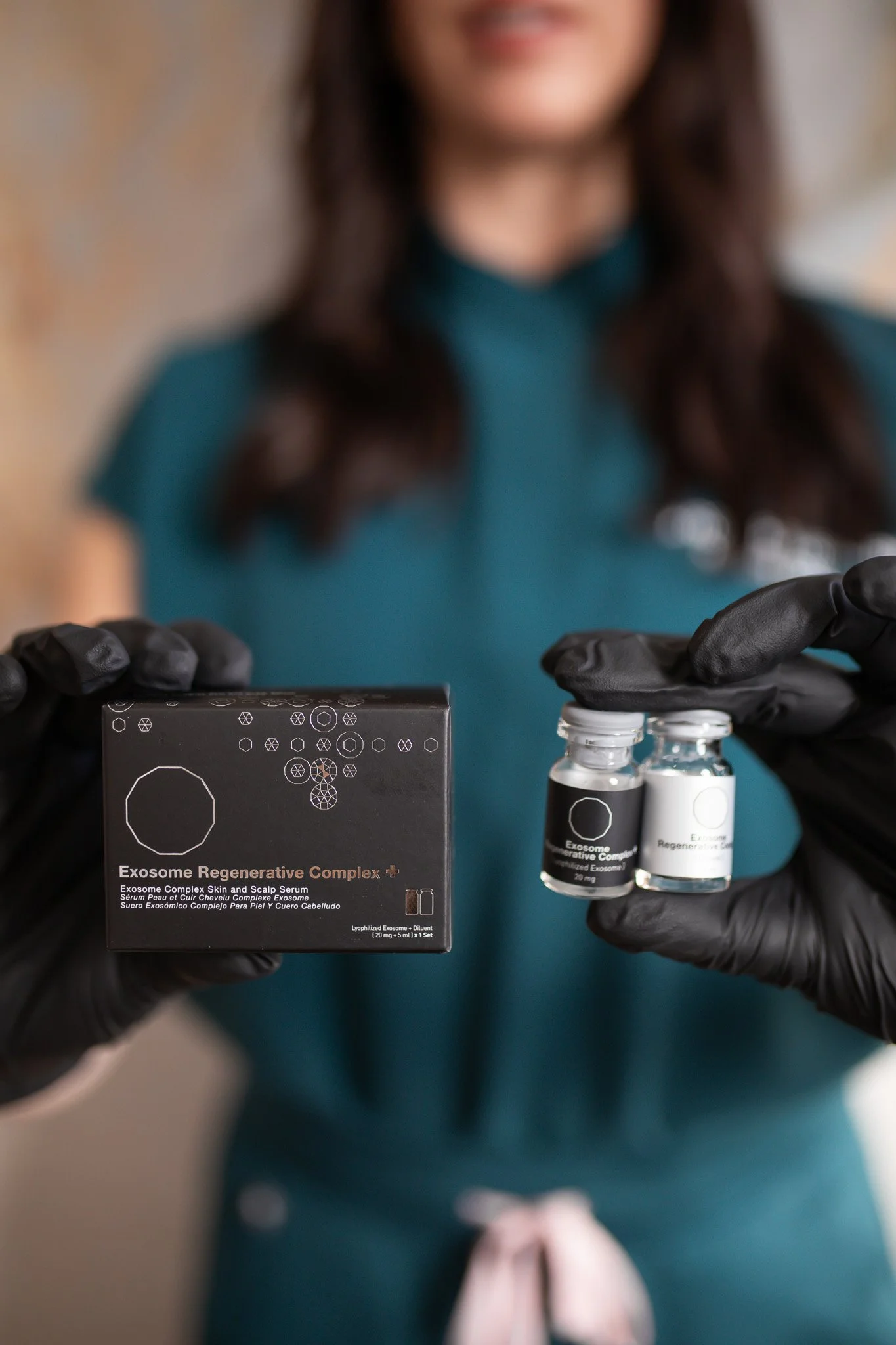 Exosomes: Exosomes are tiny vesicles derived from stem cells that contain potent growth factors and signaling molecules. They work at a cellular level to boost skin rejuvenation, reduce inflammation, and improve skin texture and tone. Exosomes are 100 times more potent than PRP, containing over 300 growth factors compared to PRP's 12, leading to more dramatic and faster results with fewer treatments.